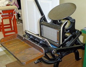 A cast iron jobbing press made in North America. I bought it in 2003, it came from Don Black via Frog Hollow Press, probably dates from the 40s or 50s at a guess. It is 22” wide, 29” deep, 34” high including the side lever. (Note: Boxcar Base sold separately)